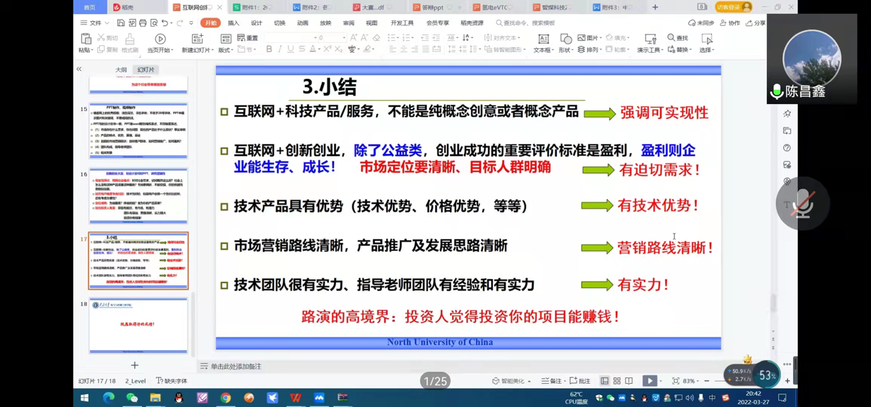 陈昌鑫老师重点从“如何撰写创业计划书”和“如何制作PPT”两个方面为出席会议的师生进行了细致讲解,并对已完成组队的项目,就后续提交材料和答辩工作的展开提出建议;就创业计划书、答辩PPT的制作进行了介绍,为参赛组的工作提了供思路;同时强调项目中要体现可实现性、大众需求性以及技术优势。最后陈昌鑫老师“睿智创新始于心,激情创业践于行。”勉励自拍外流