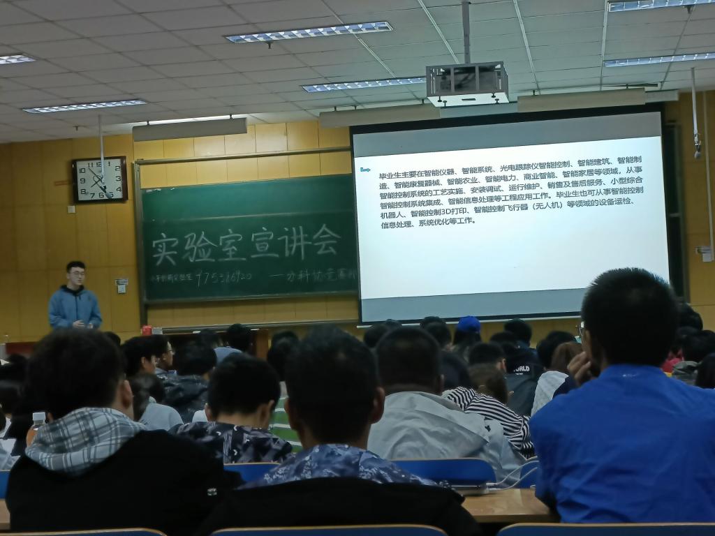 本次宣讲的实验室有智联科技创新实验室和智能控制创新实验室。智能控制创新实验室主讲人王安,讲述了创新实验室的日常活动,并对各自实验室的组成、特色和发展方向进行了讲解,让同学们感受到科技与创新相结合的新体验,也为同学们讲解实验室的器材以及进入实验室的考核条件,并且通过准备好的视频让同学们领略到了机器人的神奇功能,了解到了更多关于机器人赛事方面的知识。第二位主讲人尹嘉麒从培训内容和研究工作以及实验室的创新方向、近几年的发展规划为大一新进行详细的讲解。