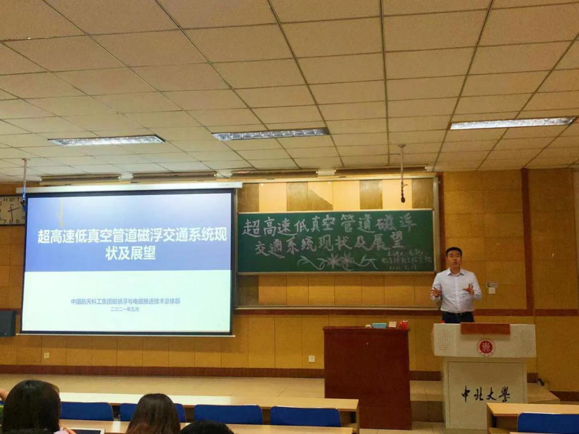 讲座上,毛凯主任分别从发展趋势、发展时机、发展现状、发展生态、发展愿景等五个方面,向同学们介绍了超高速低真空管道磁浮交通系统的基本情况。超高速低真空管道磁悬浮高速飞车(简称“高速飞车”)利用超导磁悬浮技术与地面脱离接触消除摩擦阻力,利用内部接近真空的管道线路大幅减少空气阻力,从而实现1000km/h以上的“近地飞行”,具有更快速、更便捷、更舒适、更安全和经济可控的特点。近日,围绕国家、省重大战略需求,山西省立项筹建高速飞车山西省实验室。超高速低真空管道磁悬浮高速飞车实验室依托自拍外流