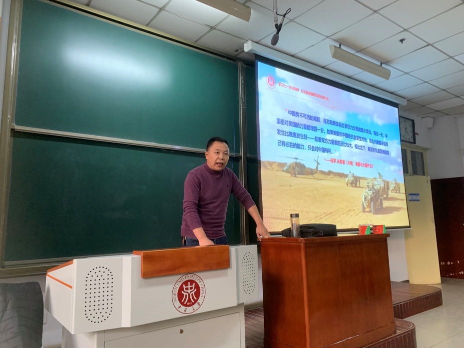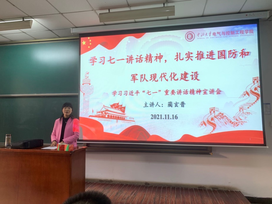 宣讲会上,蔺玄晋老师开展以"学习七一讲话精神,扎实推进国防和军队现代化"为主题的宣讲活动。他从五个方面及不同时代展示了国防、军队的重要性,以及我国在军事方面取得的辉煌成就。