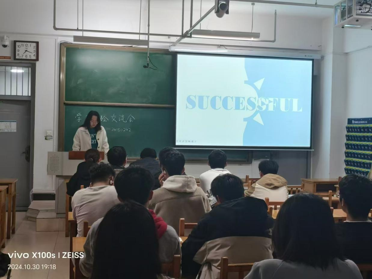 本次交流会首先由尹君儒进行分享,他从学习成绩,竞赛获奖,个人经验,发展规划四个方面给同学们分享。首先给大家介绍了他的学习经历,讲解如何高效学习,劳逸结合,最大化利用时间,同时学习的时候也要注意身体和心理健康。第二,给大家讲述了他的竞赛经历以及意义,对以后找工作的的价值。也向大家介绍了学校实验室的用处,推荐大家积极加入实验室,多参加比赛,积累经验。第三,给大家介绍了他的大学学习经验,强调大一绩点的重要性,对以后保研的帮助。最后,他向同学们建议,一定要提前规划大学四年,尽早制定好目标,为之奋斗。