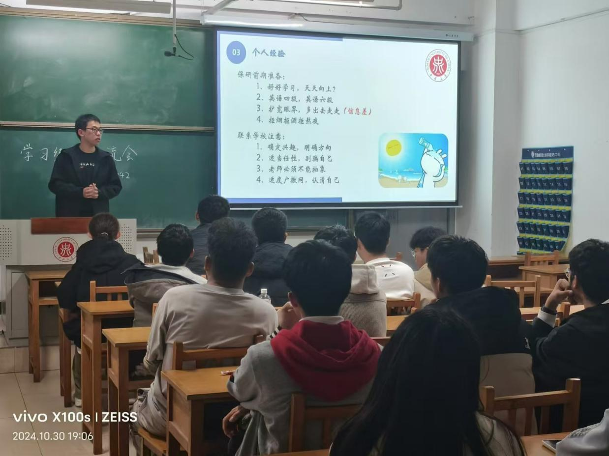 在15305H教室举办了第五期榜样引领学习经验交流会,本次讲座由保研学生尹君儒,崔李多面向24150242进行讲解。