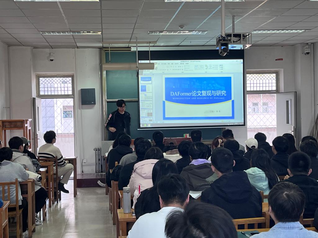 第一位主讲人是郑乾,他首先为同学们分享了申博的经验,他强调要以项目为基础,保持良好的论文阅读习惯,其次他为大家讲解了自己研究方向相关知识,以《DAFormer论文的复现与研究》为题进行详细阐述。