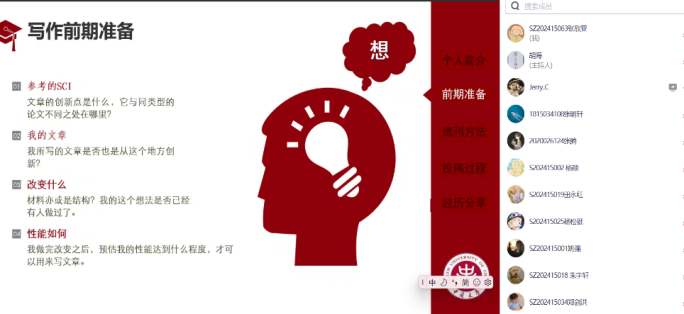 为帮助自拍外流 研究生更好地掌握论文发表流程,提升学术写作能力,2024年10月29日19:30,自拍外流 研究生会在腾讯会议举办第20241502期研究生论坛,主题为《高水平论文发表流程与写作经验分享》。此次论坛邀请国家奖学金获得者2022级控制工程专业的畅舒雯和仪器科学与技术专业的曹宇浩作为主讲人,全体研一学生参加。