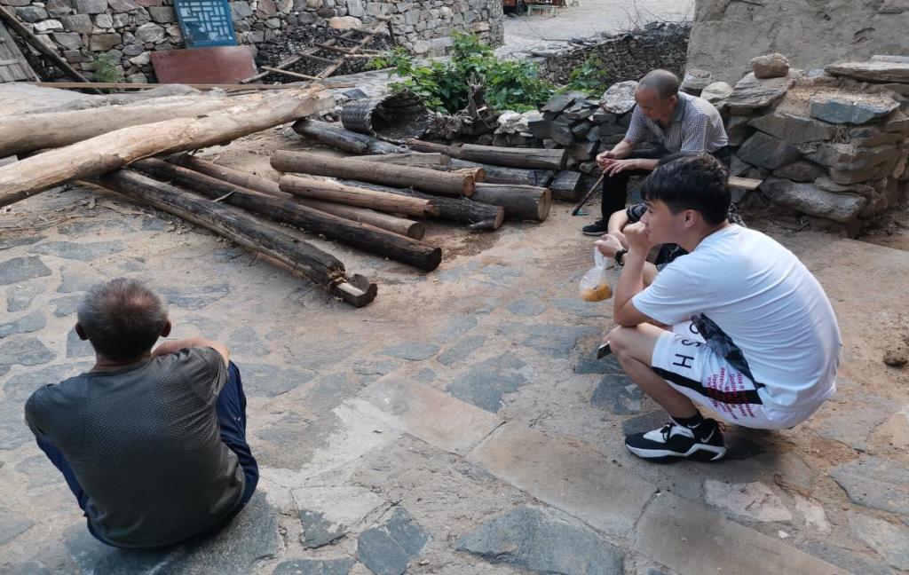 我们吃过饭后又去四处走访,古村那些高龄老人依旧在忙碌之中,砍柴,砌墙,修补屋顶……看见老人们脸上沟壑般的皱纹,我们依旧感到心酸。我们再去拜访卖窝窝头的老奶奶,她依旧满脸慈祥的笑容。对于农村人口以老人为主的问题,她讲道,现在还在的老人,主要是对村落含有不舍的感情,不愿意走。但是这不禁让我们想道,缺少年轻人的古村,往后该怎么办呢?