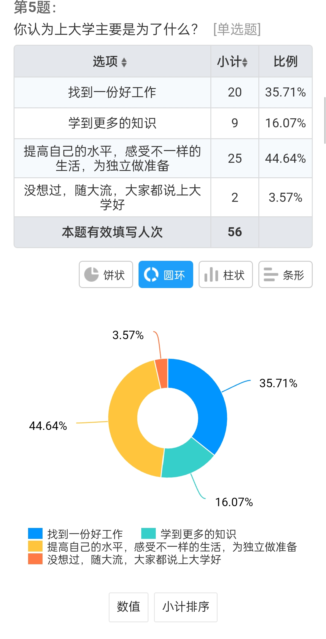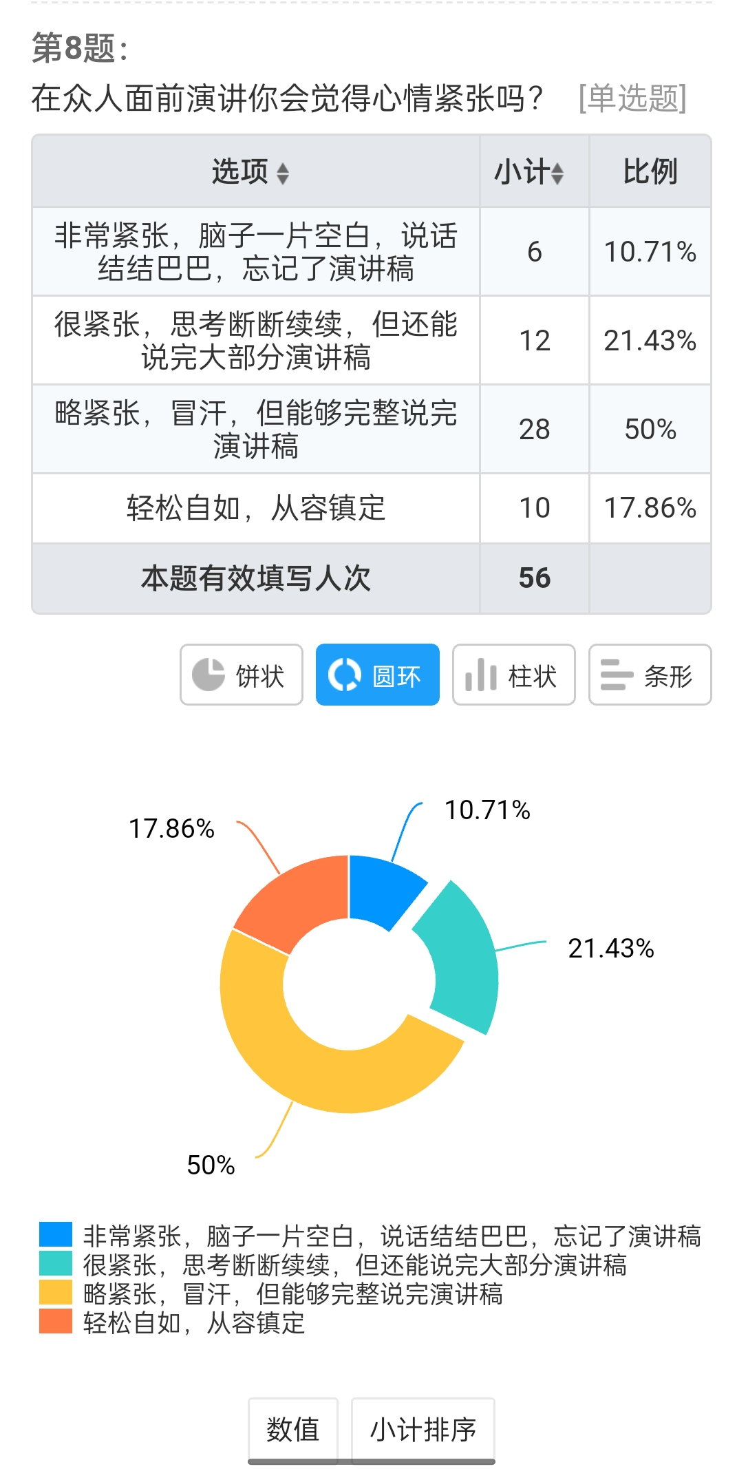 其中,在关于“你上大学主要是为了什么”的问题中,选择“提高自身水平,感受不一样的生活,为独立做准备”的占44.64%、“找一份好工作”的占35.71%、“学更多的知识”的占16.07%、“没想过,随大流”的占10.71%。在关于“在众人面前演讲会心里紧张”的问题中,选择“略紧张,可以完成演讲的”的占50%,、“很紧张,可以大致完成的”的占21.43%、选择“轻松自如,从容镇定”的占17.86%、“非常紧张,脑子一片空白,说话结结巴巴,忘记演讲稿”的占10.71%。